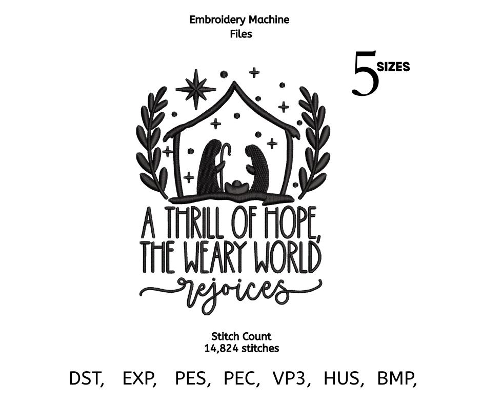 Celebrate the spirit of Christmas with this heartwarming Nativity Scene embroidery design, featuring the phrase “A Thrill of Hope, The Weary World Rejoices.” Perfect for holiday decorations, church gifts, or keepsake garments that honor the birth of Christ.