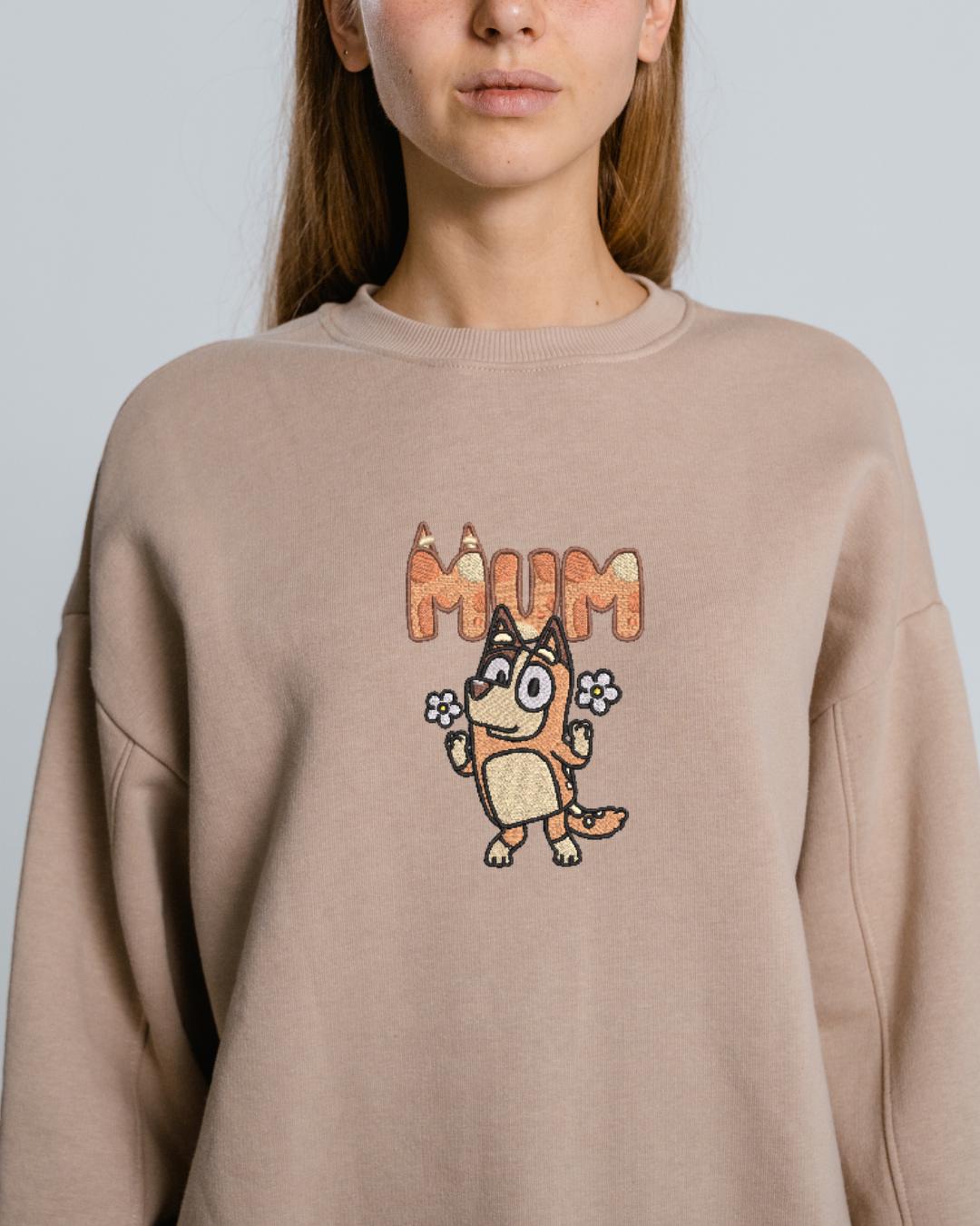 Celebrate mums with this adorable cartoon-style mum dog embroidery design, perfect for Mother’s Day gifts, kids’ outfits, tote bags, aprons, hoodies, and family-themed apparel.