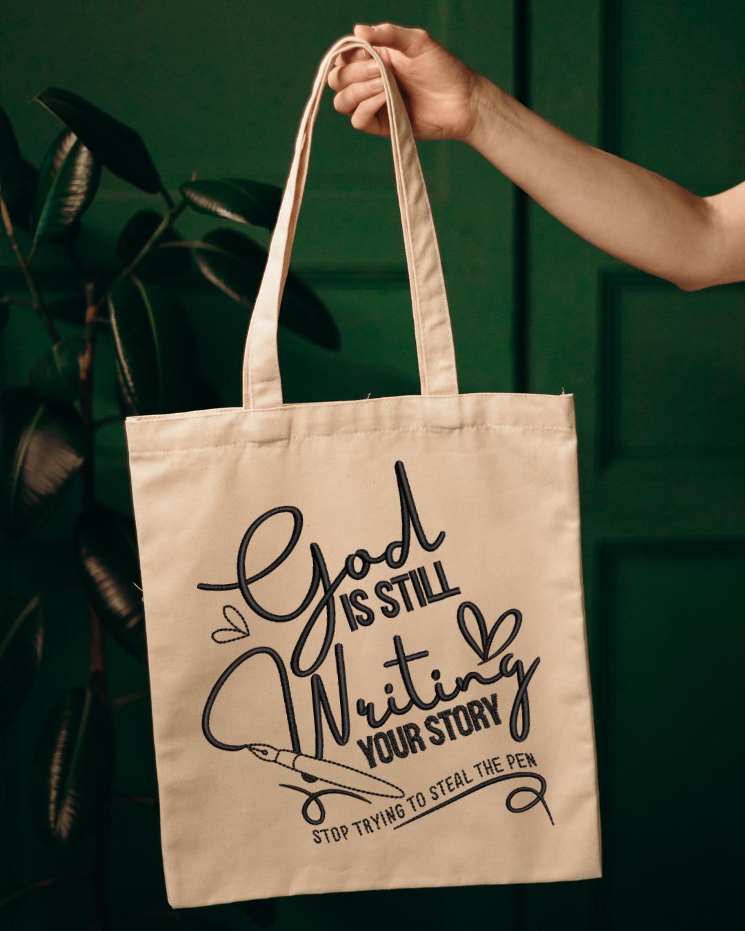 Bring a meaningful and uplifting touch to your projects with this Christian inspirational embroidery design featuring the quote “God is still writing your story — stop trying to steal the pen.” Perfect for sweatshirts, tote bags, Bible covers, gifts, and home décor.