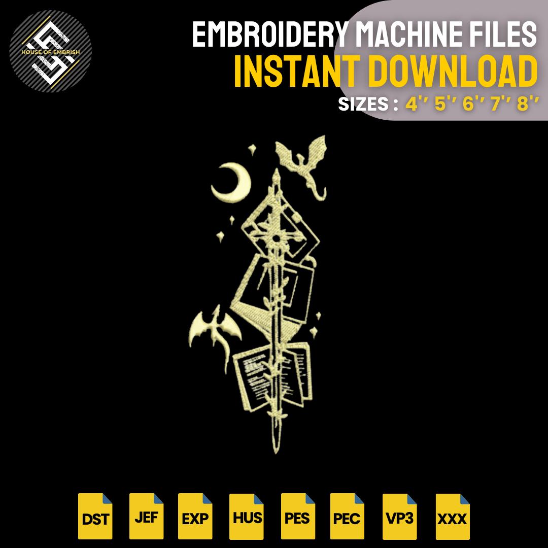 Add a touch of fantasy magic to your projects with this beautifully digitized Fourth Wing inspired dragon, books, and moon embroidery design.