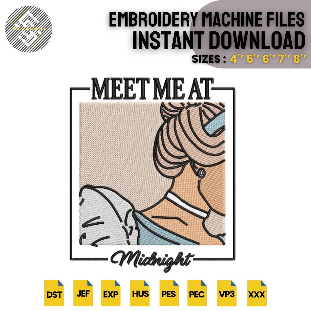 This beautiful embroidery pattern features a stylish princess silhouette framed in a vintage box design with the quote “Meet Me at Midnight.”