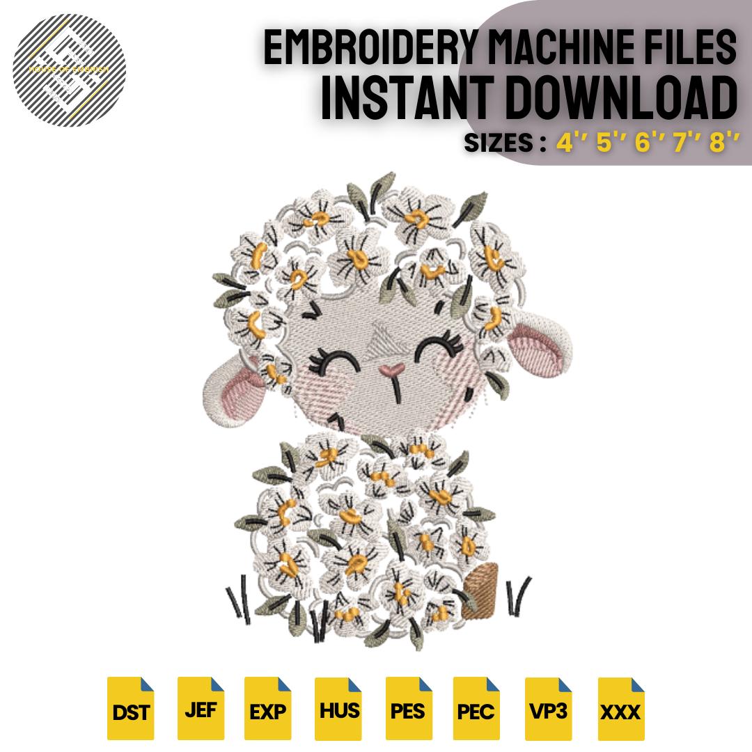 This adorable floral lamb embroidery pattern features a sweet baby sheep covered in stitched flowers, perfect for spring, Easter, nursery décor, baby clothing, kid accessories, and boutique embroidery projects.