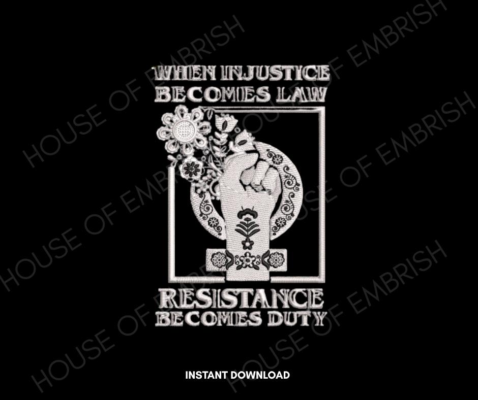 Make a powerful statement with this bold Resistance Quote Embroidery Design. Featuring a raised fist surrounded by decorative elements and the inspiring quote “When Injustice Becomes Law, Resistance Becomes Duty”, this design is perfect for activism apparel, statement jackets, tote bags, wall art, and meaningful embroidery projects.