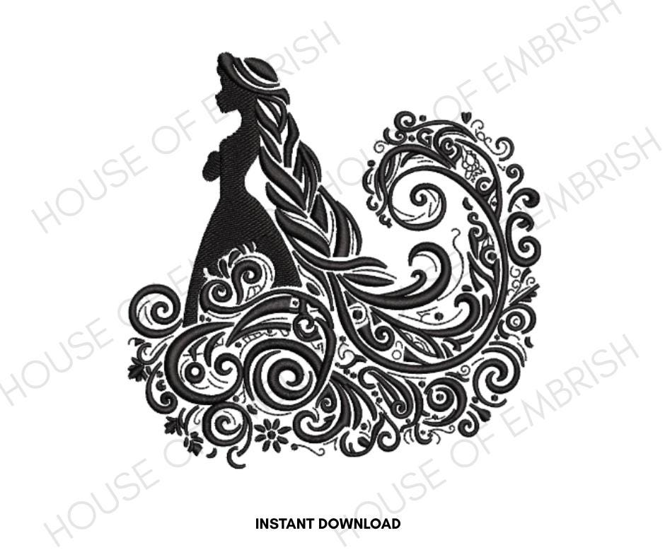 This beautiful design features a graceful lady wearing a flowing dress filled with ornamental floral swirls, perfect for classy, artistic, and decorative embroidery projects.