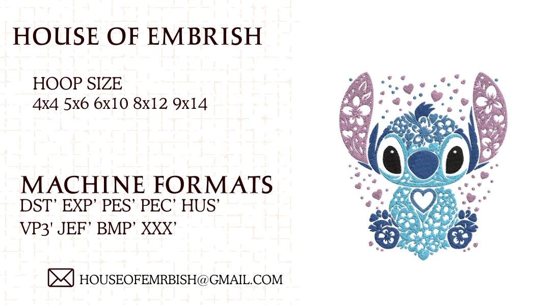 Add a cute and magical touch to your embroidery projects with this Blue Alien embroidery design, beautifully decorated with floral lace details and hearts. This design is professionally digitized for smooth stitching and excellent results on embroidery machines.
