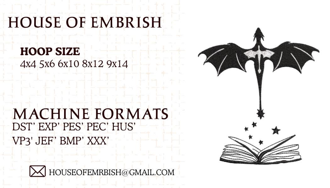This listing features a fantasy dragon flying out of a magic book embroidery design, beautifully digitized with sharp details and smooth stitching. A perfect choice for fantasy lovers, book readers, gothic themes, and creative embroidery projects.