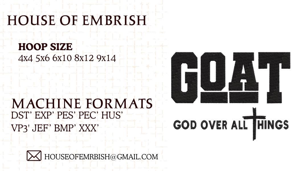 This listing features a powerful GOAT – God Over All Things embroidery design, created for faith-based apparel and meaningful embroidery projects. Clean lettering and bold stitching make this design perfect for Christian clothing, church wear, gifts, and inspirational projects.