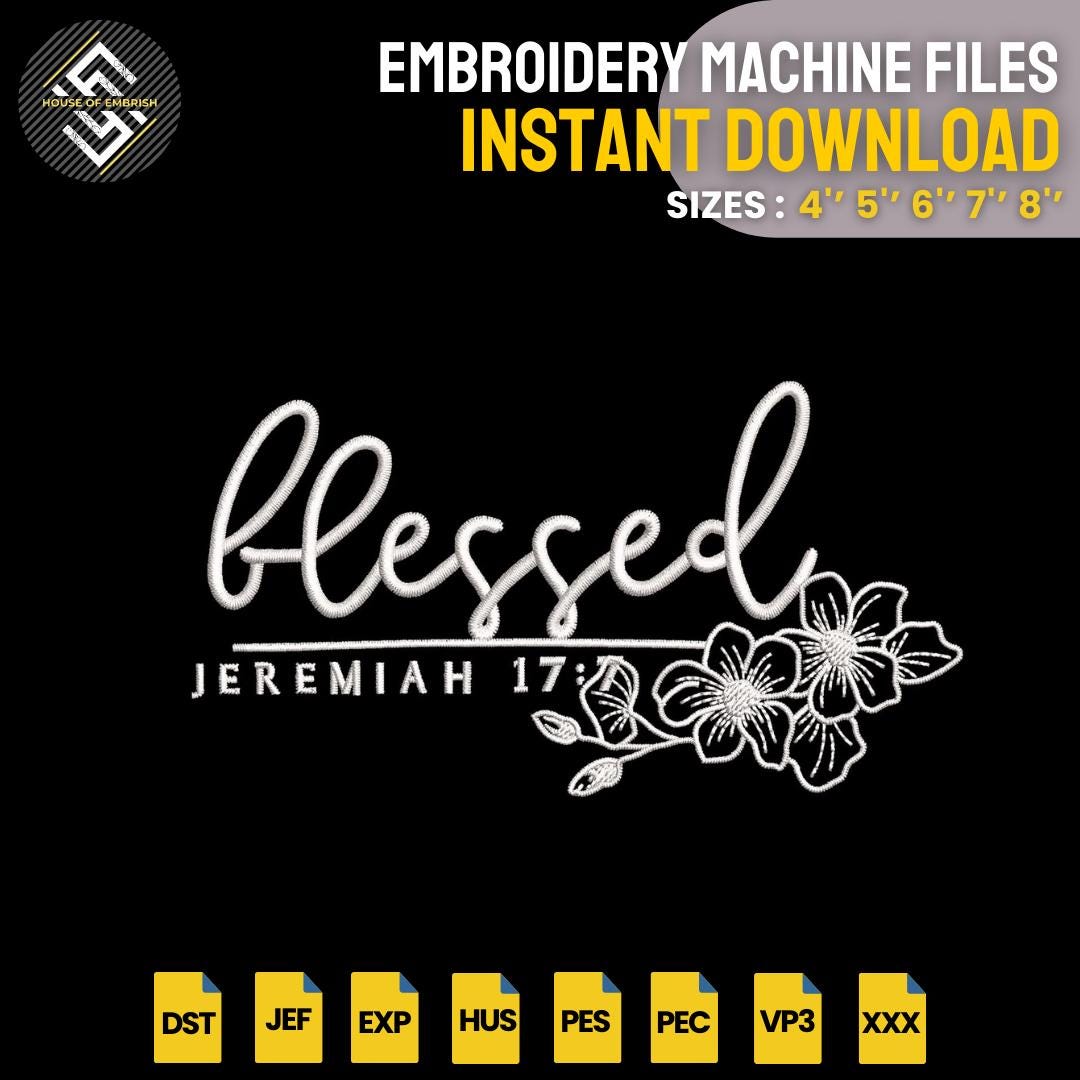 Create meaningful and faith-inspired embroidery projects with this “Blessed” Scripture Embroidery Design featuring Jeremiah 17:7 and elegant floral details.