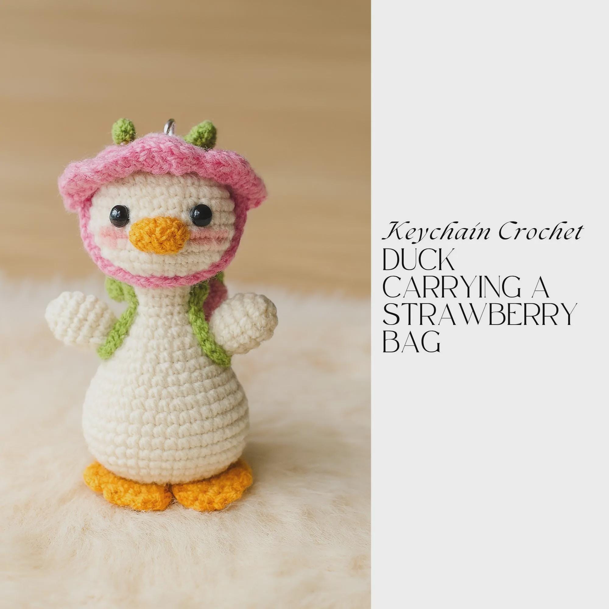 Create a charming and playful handmade accessory with this Duck Keychain Crochet Pattern featuring a Strawberry Bag. This digital crochet pattern guides you step by step to make a cute mini duck with sweet details, perfect for use as a keychain, bag charm, zipper pull, or small handmade gift.