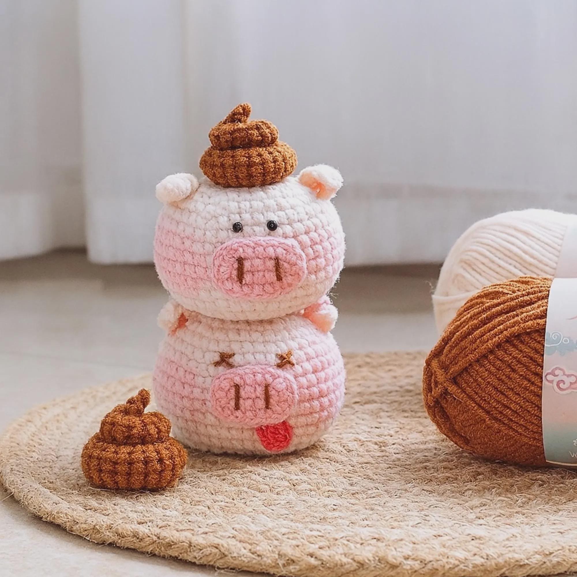 The design features a compact, rounded pig shape with expressive facial details that give it a humorous and lovable personality. The instructions are written in clear, easy-to-follow English, making this pattern suitable for beginners to intermediate crocheters.